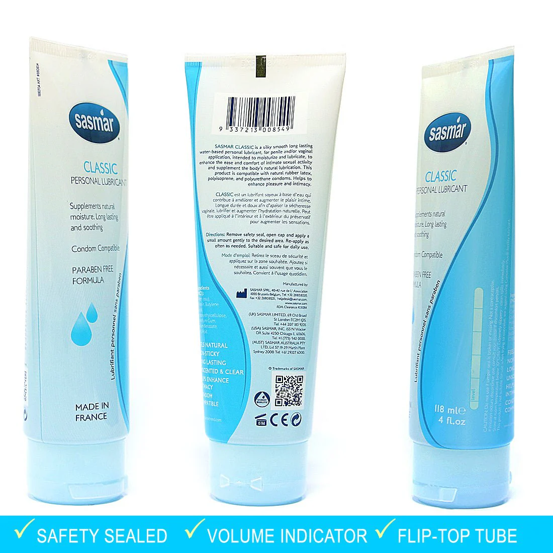 SASMAR CLASSIC Personal Lubricant (4 fl. oz) offers a dependable solution for enhancing your intimate moments. Formulated to provide a silky glide, this water-based lubricant is safe for use with all types of condoms, including natural rubber latex, polyurethane, and polyisoprene. Its gentle formula is designed to minimize irritation, making it ideal for individuals with sensitive skin. The user-friendly tube format allows for precise application, ensuring a mess-free experience. SASMAR CLASSIC is also biocompatibility tested to guarantee safety, providing confidence for users seeking both comfort and quality.
